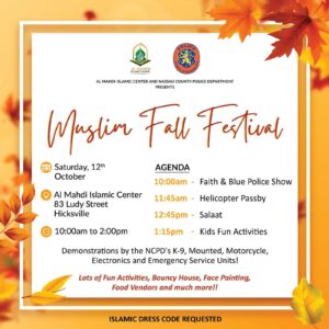 « All Events This event has passed. Muslim Fall Festival – Saturday 12th October, 2024 October 12, 2024 @ 10:00 am - 2:00 pm Event Navigation Monday, January 20th | 20th Rajab Night » Islamic date: + Google Calendar+ iCal Export Details Date: October 12, 2024 Time: 10:00 am - 2:00 pm