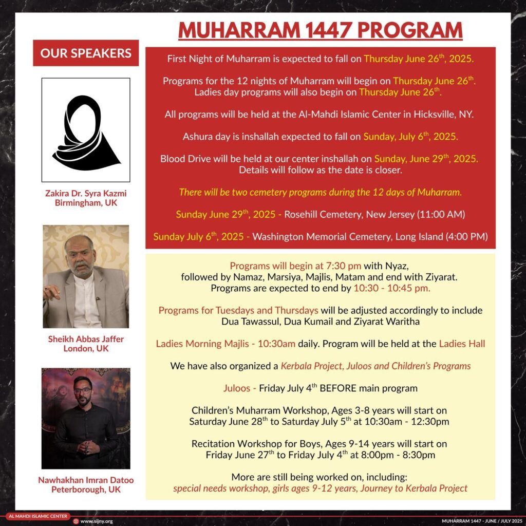 Programs for the 12 nights of Muharram will begin on Thursday, June 26th. Ladies day programs will also begin on Thursda,y June 26th. All programs will be held at the Al-Mahdi Islamic Center in Hicksville, NY.